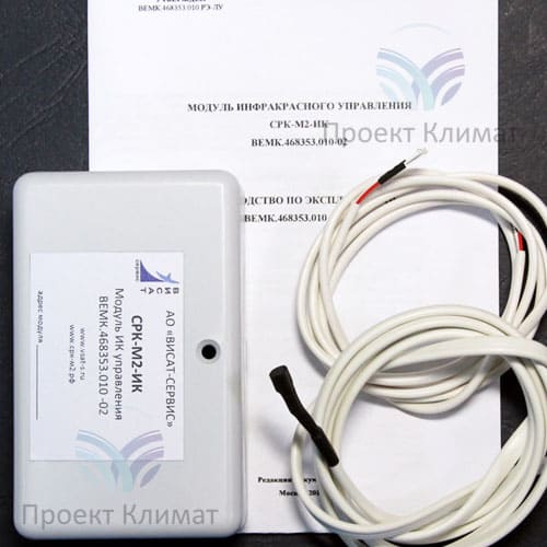 Модуль СРК-М2-ИК позволяет управлять по каналу инфракрасного управления практически любым кондиционером, имеющим ИК пульт управления. Для этого предварительно необходимо провести процедуру «обучения» СРК-М2-ИК путём записи в него сигналов «ВКЛ» и «ВЫКЛ» с «родного» пульта, поставляемого с кондиционером. Делается это с помощью модуля СРК-М2-У.