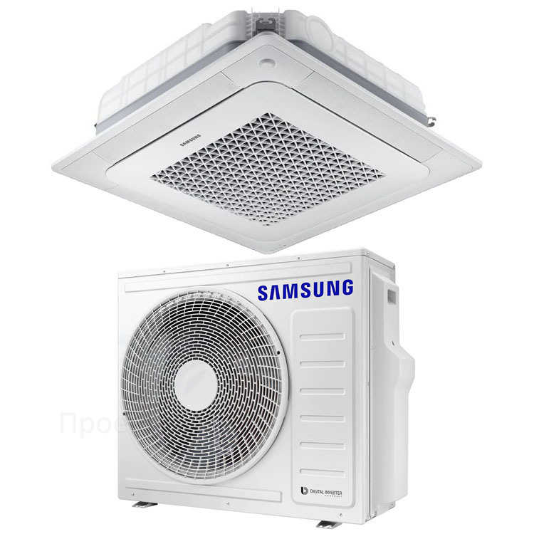 Функций в кассетном кондиционере, как и в канальном, не особо много. Основное - это его техническая функциональность, монтаж под потолком, простота размещения благодаря наличию встроенной помпы для откачки конденсата к ближайшей точке слива. Плюс - это распределение воздуха: по четырём (а у некоторых моделей - круговая) раздача. Большая площадь теплообменника сказывается на эффективности. Инверторные компрессора - гарантия долговечной и экономичной работы на всех режимах.