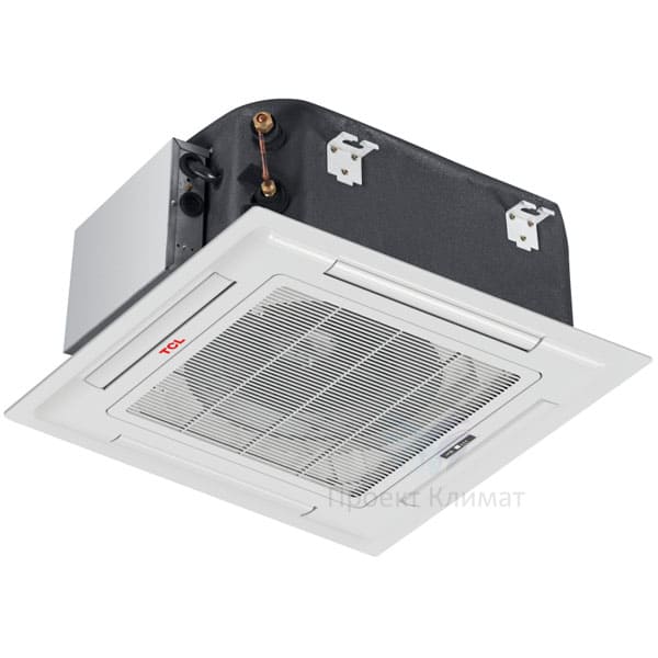 Вариант для скрытой установки: под чистовым потолком. Монтируется на шпильки. Сам TQCM-12HRID будет говорить о своём присутствии только панелью, через которую осуществляется забор и раздача воздуха. Распределяется воздух по четырём отдельным направлениям и направляется створками жалюзи. Рассчитана модель на охлаждение помещения с площадью до 35 м².