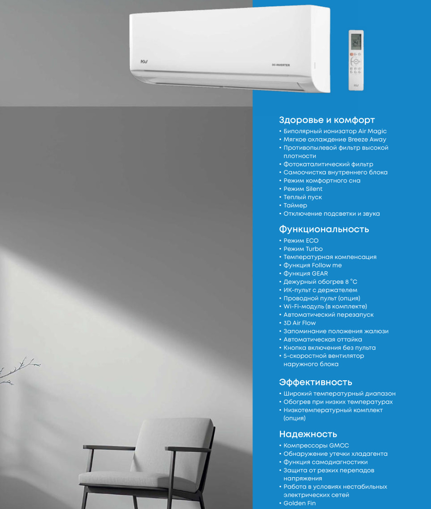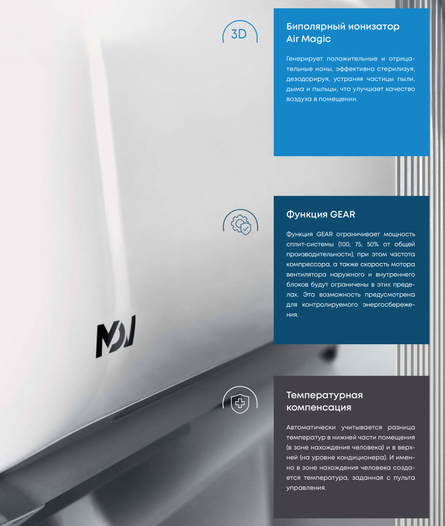 Новинка модельного ряда MDV — серия INFINI MEGA Inveɒer — сочетание полюбившегося дизайна и мощности. Инверторная сплит-система для охлаждения или обогрева больших площадей до 104 м2. Система оснащена комплектным Wi-Fi-модулем для удаленного управления, а также имеет широкий набор функций для очистки воздуха. О здоровом климате позаботятся биполярный ионизатор, фотокаталитический фильтр и система самоочистки внутреннего блока.