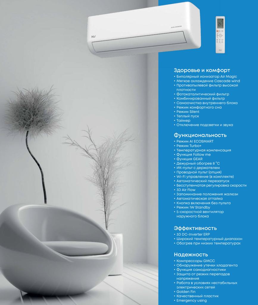 Классический инверторный кондиционер с 3D-обдуовм, отличной фильтрацией и управлением со смартфона.