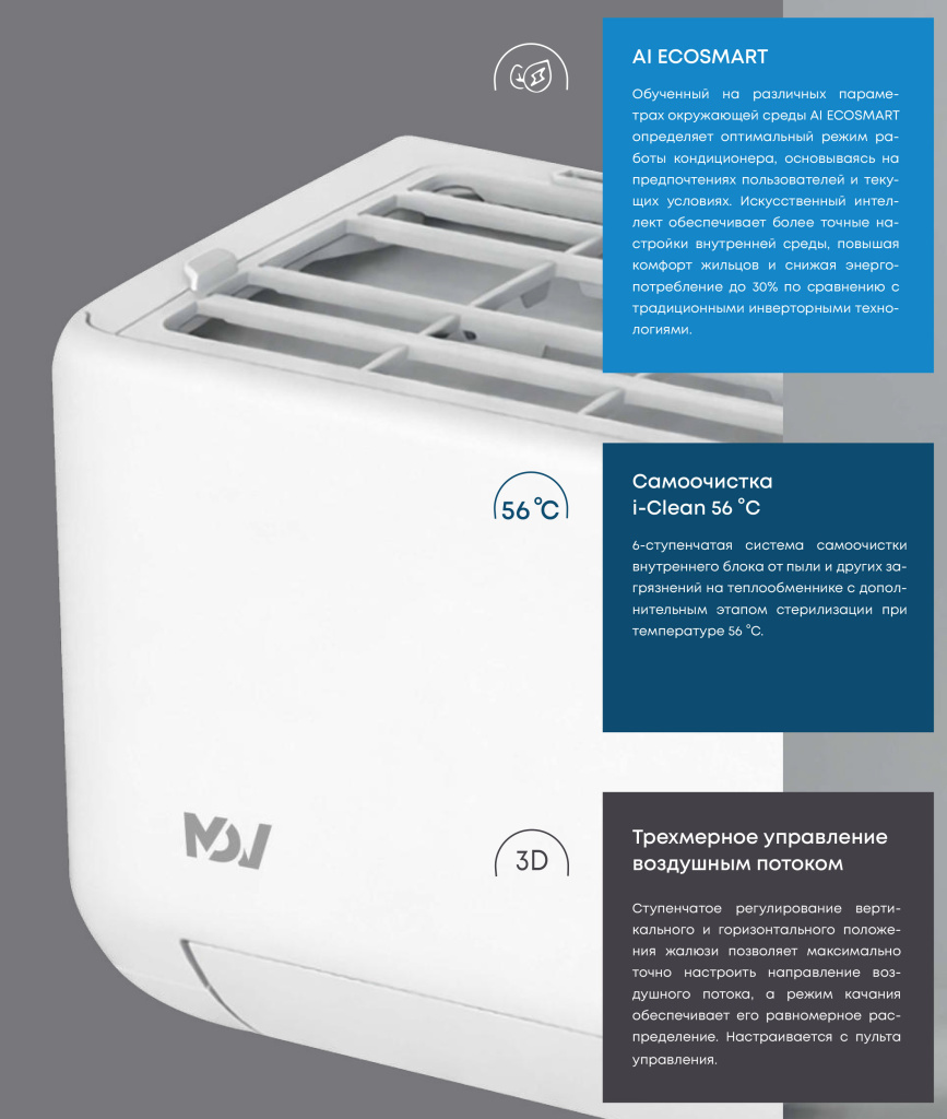 Новинка модельного ряда MDV — серия iERA Inveɒer — сочетание минималистичного дизайна и передовых технологий. Инверторная сплит-система исполнена в белом матовом корпусе и оснащена встроенным искусственным интеллектом. Обслуживание внутреннего блока облегчает быстросъемный воздушный фильтр, который устанавливается в верхнюю часть корпуса. За очистку воздуха также отвечают встроенный фотокаталитический фильтр и ионизатор, а функция 3D Air-Flow обеспечивает равномерное воздухораспределение внутри помещения.