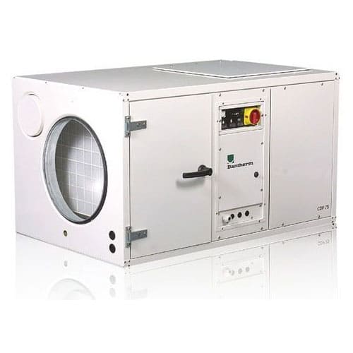 Стационарный настенный осушитель воздуха Dantherm CDP 75 водяное охлаждение использует базовый принцип конденсации влаги: при одинаковой относительной влажности воздух, имеющий меньшую температуру характеризуется меньшими значениями абсолютной влажности, т.е. содержит меньше влаги. В осушителе тёплый влажный воздух проходит сначала через испаритель, охлаждаясь и теряя при этом излишнюю влагу, а затем, чтобы не обдувать помещение холодом - через конденсатор, нагреваясь от его тёплых частей. При этом и испаритель, и конденсатор вырабатывают одинаковое количество тепла и холода, т.к. являются раздельными частями одного холодильного контура с компрессором и фреоном. Принцип кондиционера.