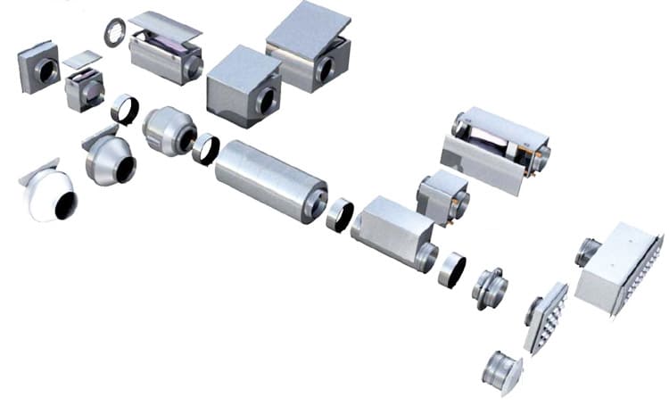 Наборная система вентиляции в качестве основного преимущества имеет возможность подбора требуемых элементов под каждый конкретный объект индивидуально. Правда, для размещения всех частей вентиляционной системы требуется значительно больше места, встаёт вопрос об опуске потолков для выполнения скрытого монтажа. Зато можно подобрать фильтр требуемого уровня, глушитель шума более эффективный, встроить в систему не электрический, а водяной элемент нагрева и т.п.